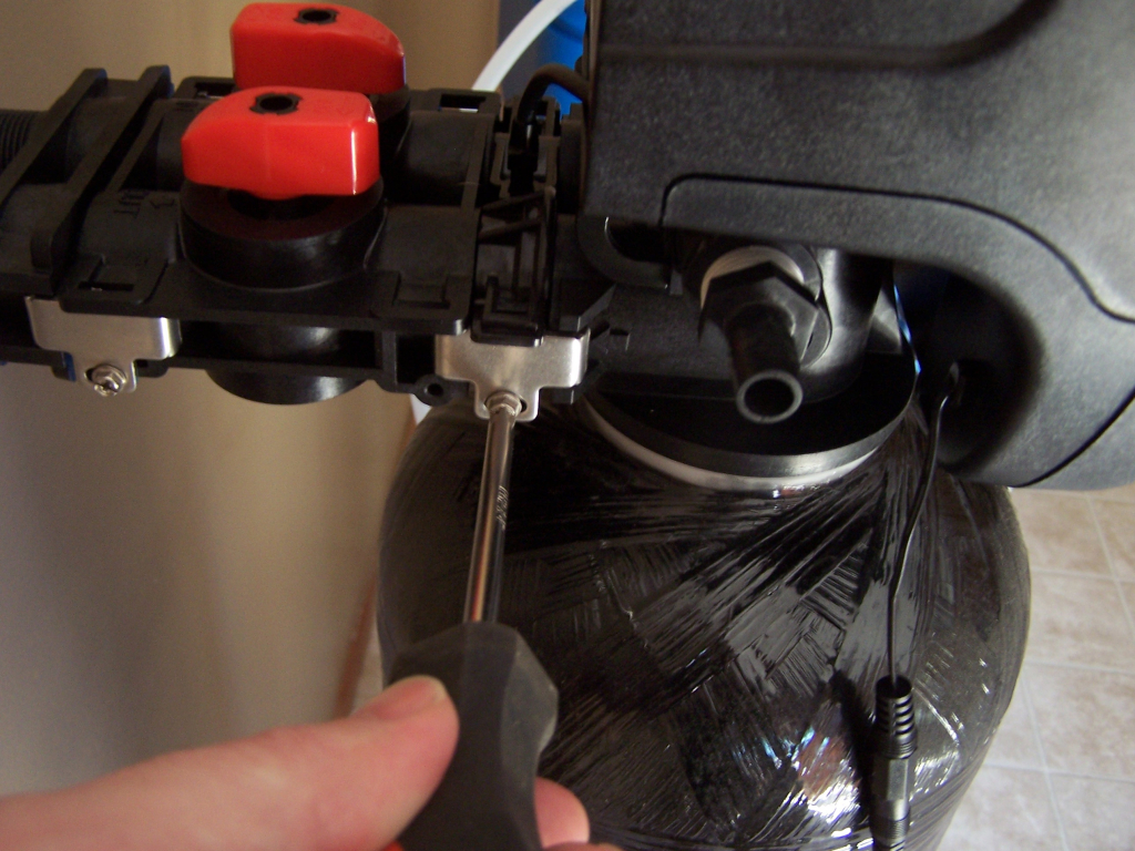 The control valve (head) now must be screwed onto the mineral tank. Be sure the large O-ring is in place and lubricated (you can use standard cooking oil to lubricate, if necessary).
