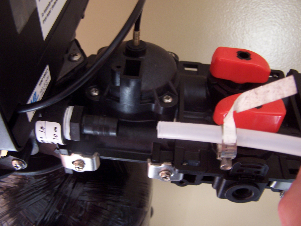 Salt tank overflow (this is the elbow on the side of your salt tank). Attach 1/2″ i.d. plastic tubing to the fitting from the salt tank and run to a drain.