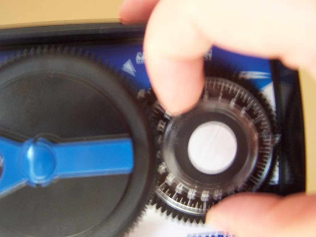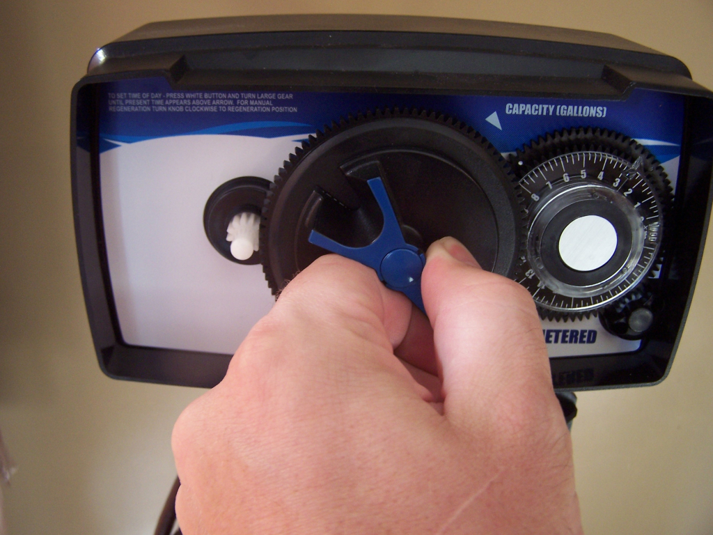 To program simply line up the gallons between regeneration. (remember each number is multiplied by 100) with the white dot. To do this pull out on the inner dial with your right hand to turn and hold the outer dial with your left hand to hold in place.